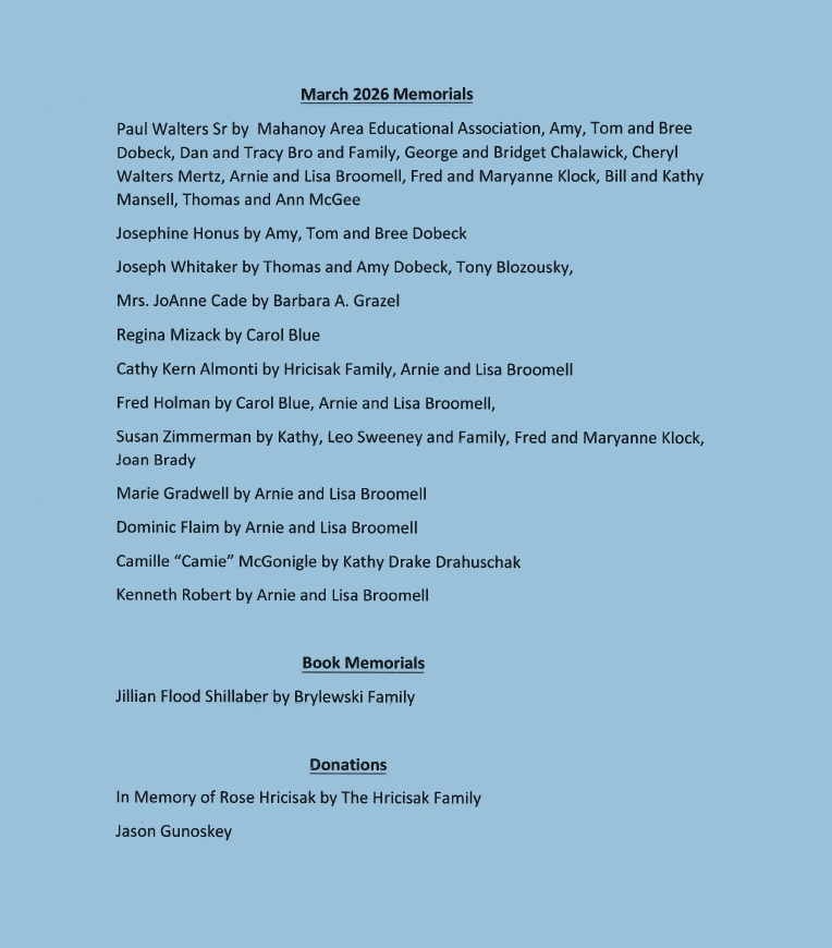 Mary and Allan Schell, Harmelin Media, Rita Rogers, Golden Oldies Luncheon Group (Retired Good Samaritan Nurses), Social Current, Inc., The Roberts & Kaczmarczyk Families, Dennis & Diane Pickett, Paul & Peg Coombe, Joan and James Goodman, Tom and Teckla McCabe, Karen and Bill Chilinskas, Robin and Dorothy Lewis, Brian and Anne Connely, Sandra Zemlavage, Bernadette Marcum,